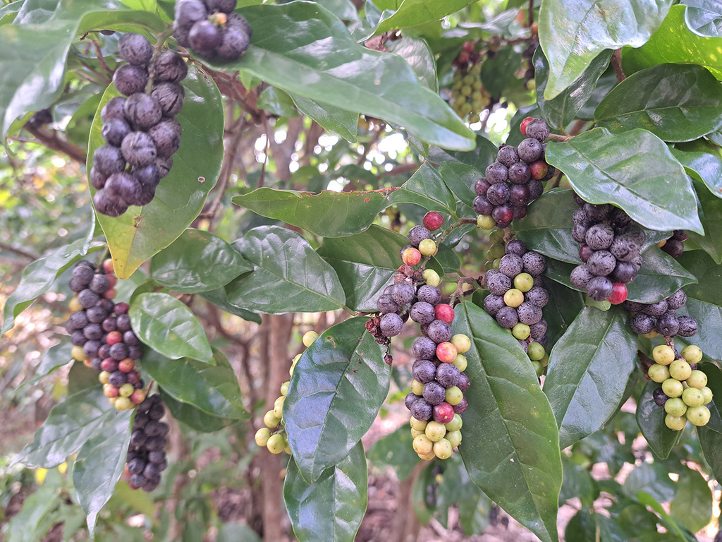 剛以圖找圖才知是「枯里珍」,俗名四季春、五蕊山巴豆,是台灣本土的原生植物,它的果實剛長的時候是綠色的,然後會依序變成黃色跟紅色,成熟時則是紫色。而且它的果實真的可以吃呢!真是大開眼界了!資料來源:自然科學博物館