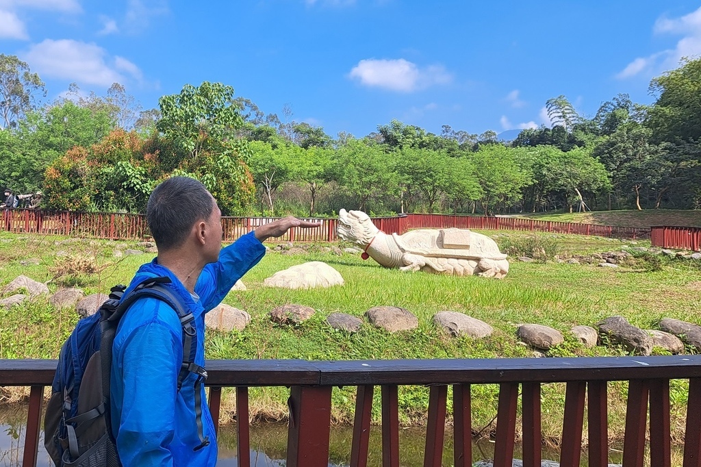 池中有一座大石龜 「贔屭」,據說是遭莫拉克風災沖毀的六龜遊客中心的六隻大石龜之一,重建新威遊客中心後移至此安置。