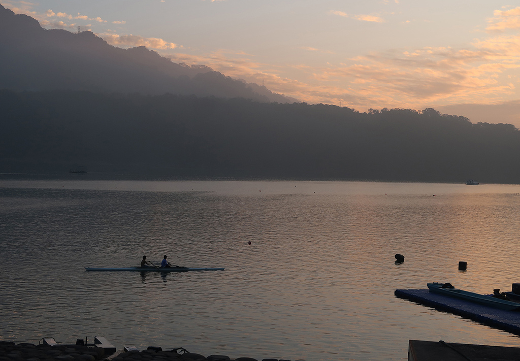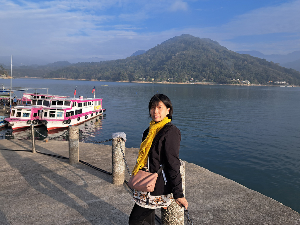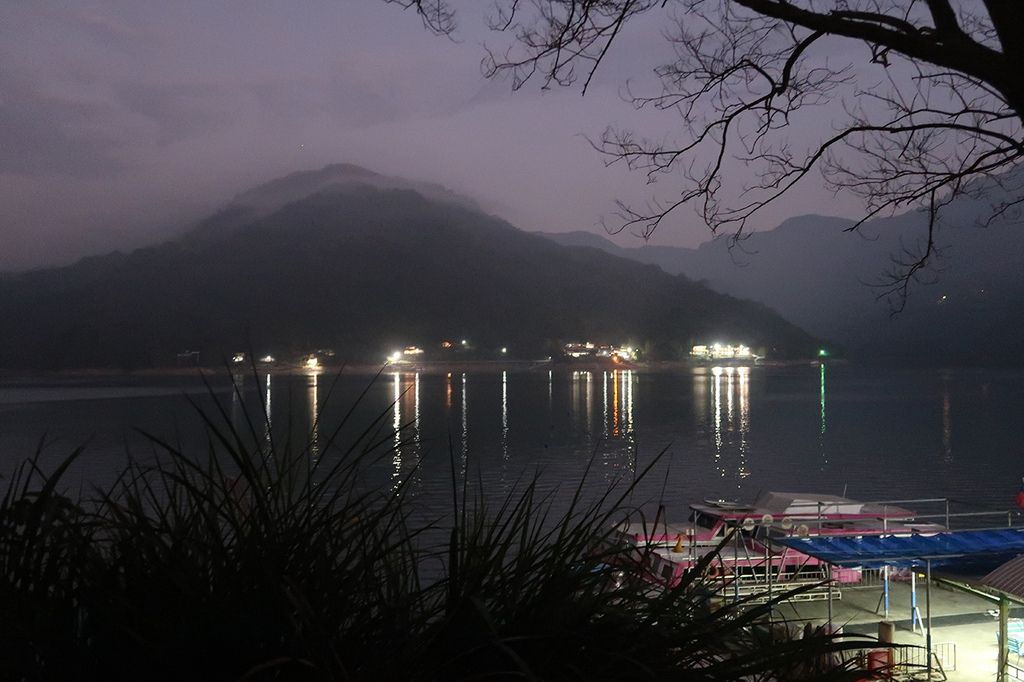 後來我們就拿板凳到湖畔,一邊吃著從角板山買過來的豆花,一邊欣賞夕陽西下的美景!
