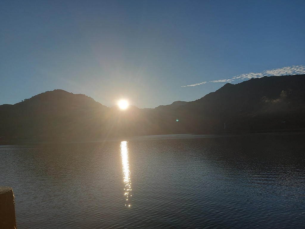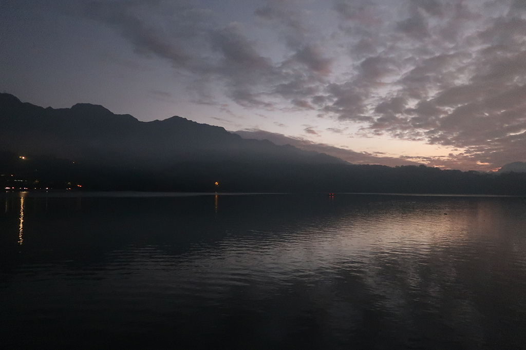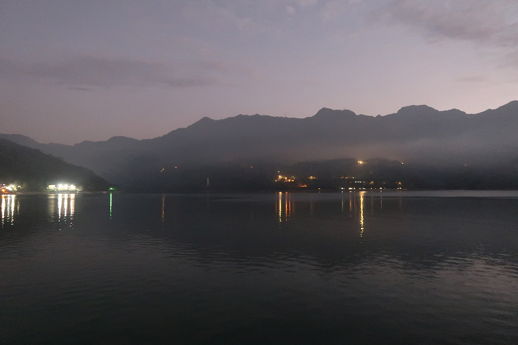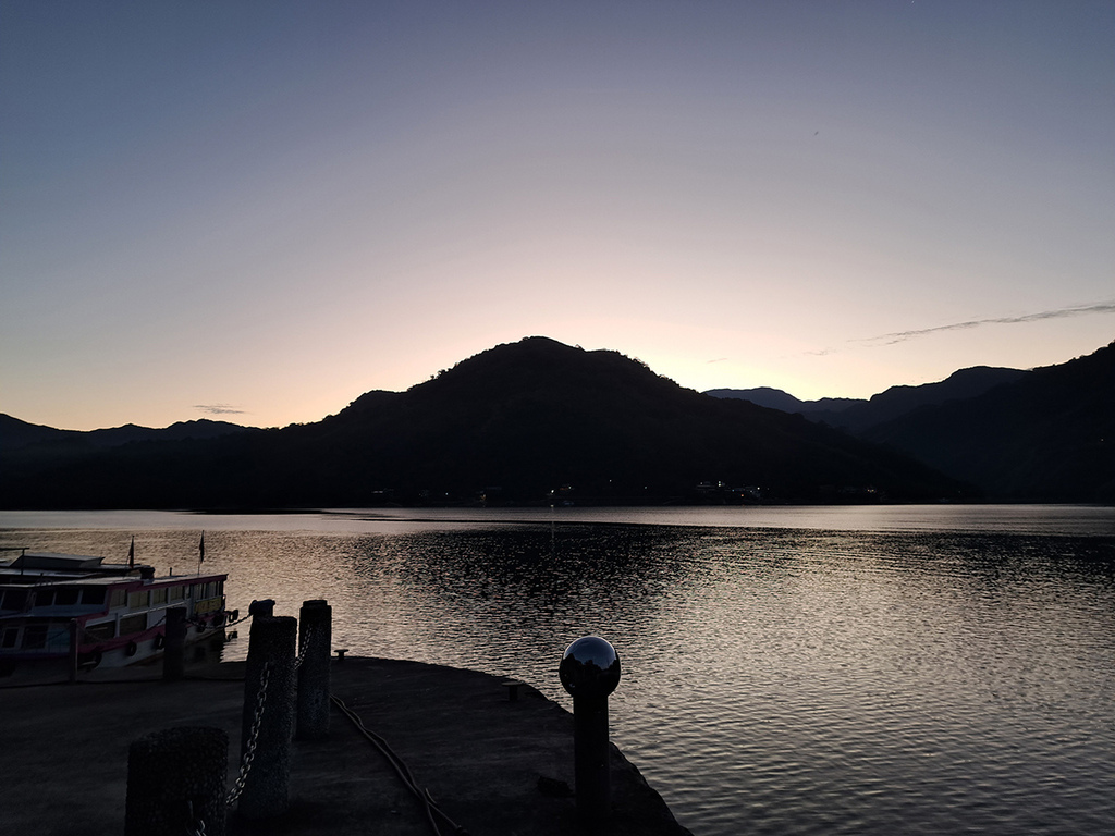 清晨06:26天仍未亮,我們看到碼頭這邊山頭泛白,想說來等待日出!