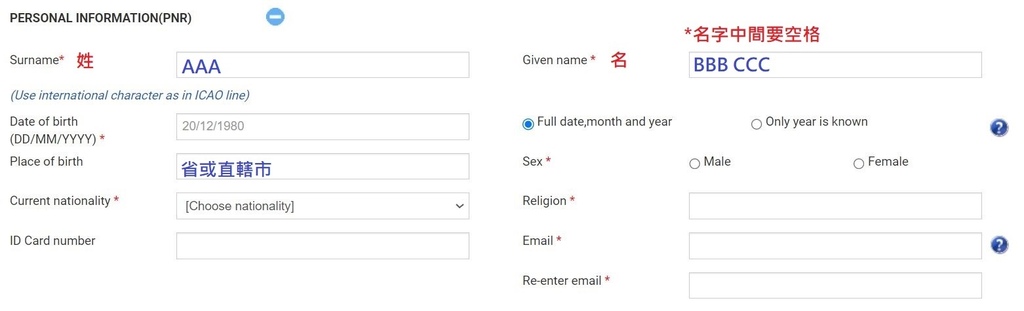 姓名的欄位很清楚,名字的中間兩字要空格,不是用-。假設姓是AAA,名字是BBBCCC,記得要打成BBB CCC,不是BBB-CCC,與護照不同,也不能相連沒有空格。