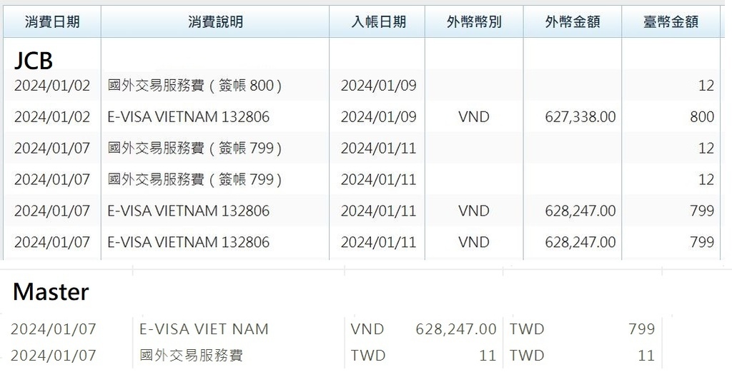 1月3日和7日簽證付款頁面的越南盾卻跟實際刷卡金額不同?