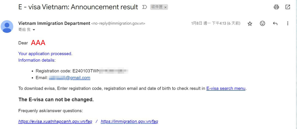 以我的申辦時間來說,1月3日 (週三)上午8點前送出申請,1月8日 (週一)下午4點多收到Email,因為是申請日上班前,當天應該也算1個工作日,這樣來說是第4個工作日收到簽證。另外3人都是1月7日 (週日)中午前申請,但分別是1月11、12、13日收到Email通知,老公是3人中第1個送出的,卻是最後一個收到,不過我在前一天就先上網去查,其實也已經可以列印了!這樣算下來是分別是第4、5個工作日。這是順利的情形下,僅供參考。