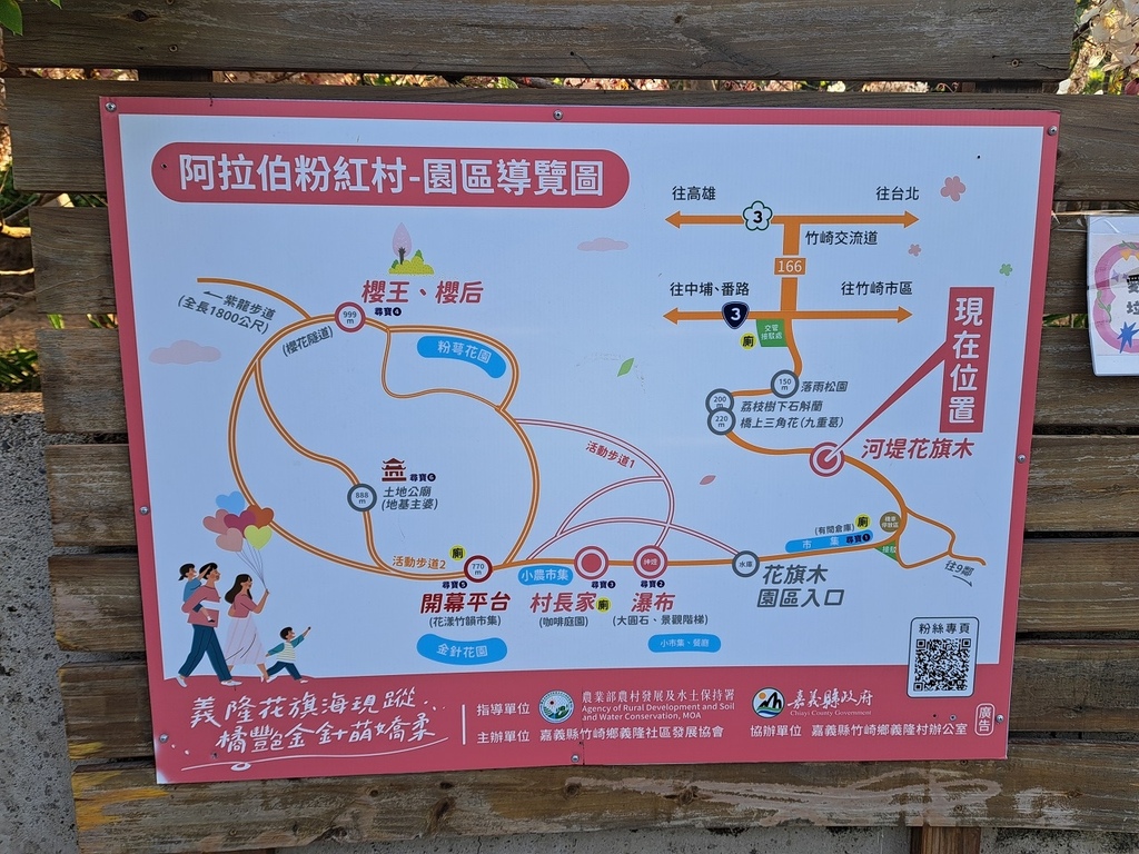 從下竹崎交流道轉166縣道後,兩側的花旗木夾道相迎,來到有「阿拉伯粉紅村」之稱的竹崎鄉義隆村,更見到滿山滿谷、宛如日韓的櫻花林!村長12年前開始種植花旗木,至今已累積超過3千棵。因為村長本人長得很像阿拉伯人,常被人稱作「阿拉伯」,所以將這裡取作「阿拉伯粉紅村」,並免費開放給大家參觀。