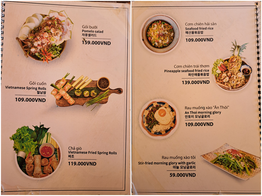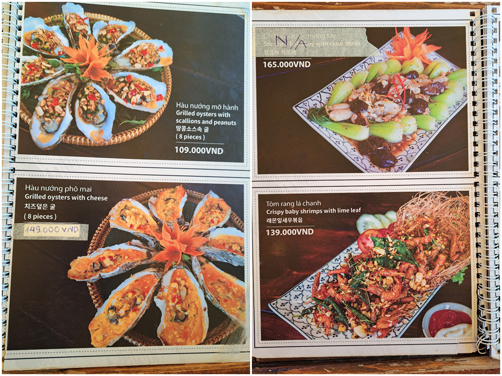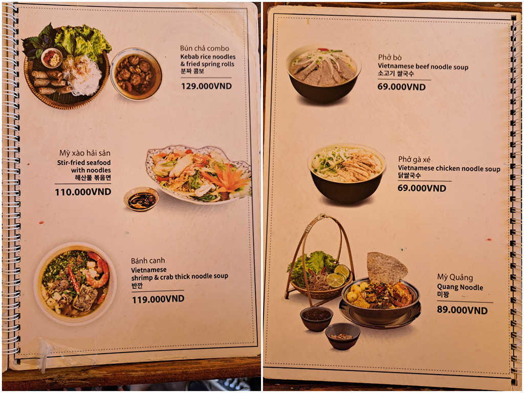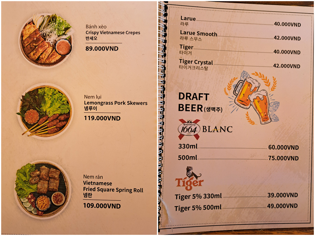 菜單有3種語言,除了越南文和英文,第3種就是韓文,以韓國物價來峴港玩,這些價錢根本是韓國的1/4而已吧!而且韓國人到越南免簽,難怪峴港到處都是韓國人!什麼時候越南才會給台灣人免簽呢?