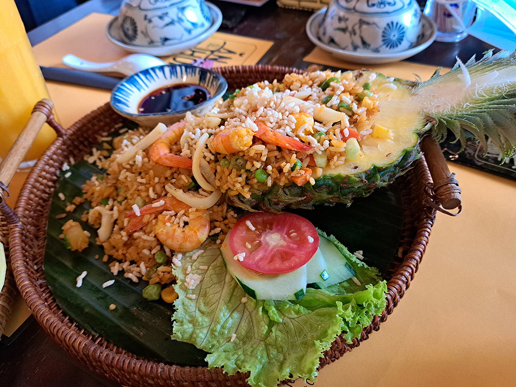 鳳梨海鮮炒飯139K,是我們點的最貴的一道餐點,算是比較台式的菜色,但折合台幣也才180元,蝦仁、花枝等份量不少,色香味俱全!而且擺盤就給半個鳳梨,我們還把底部鳳梨挖出來吃!難怪人氣很旺,幾乎每桌都會有一盤!