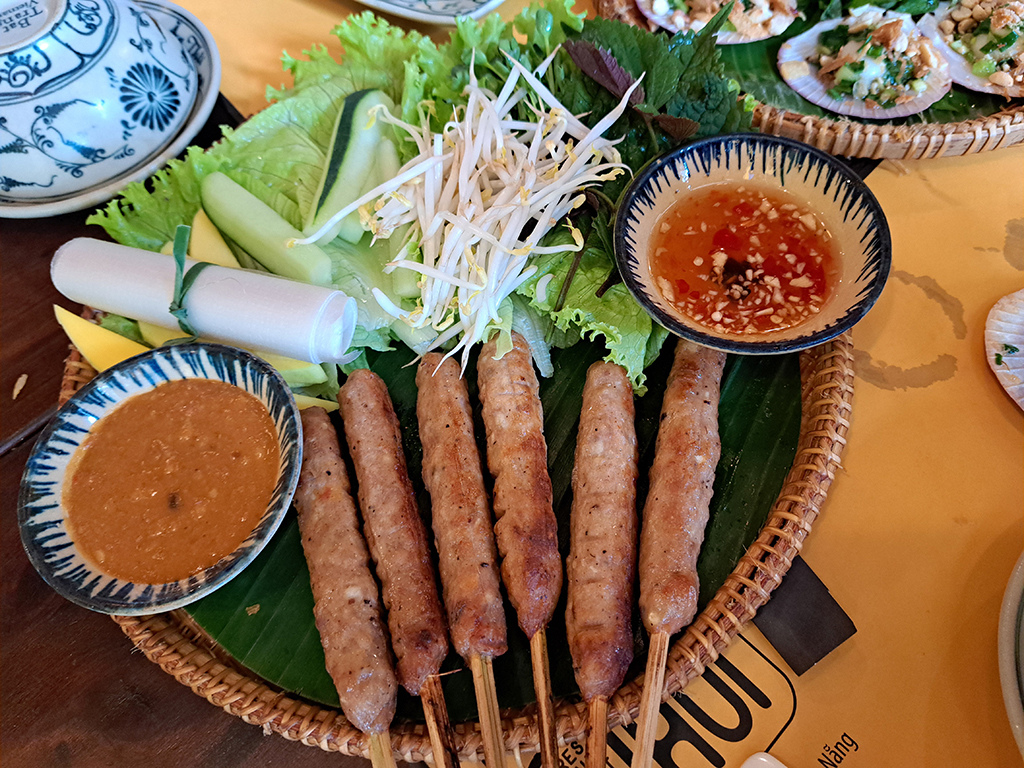 Nem lụi正確吃法應該是用米紙加上附的生蔬菜(有豆芽菜、大黃瓜、芒果、生菜),最後放上豬肉串,像春捲一樣捲起蘸醬吃。不過我們一樣不知道正確吃法,把他當沙嗲一樣直接吃,生菜都浪費掉很可惜!