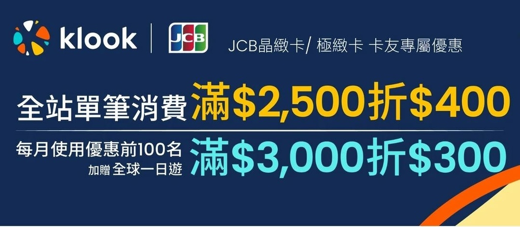 優惠碼說明:綁定JCB晶緻等級以上信用卡暨簽帳卡結帳,全站單筆訂單滿NT$2500折NT$400。