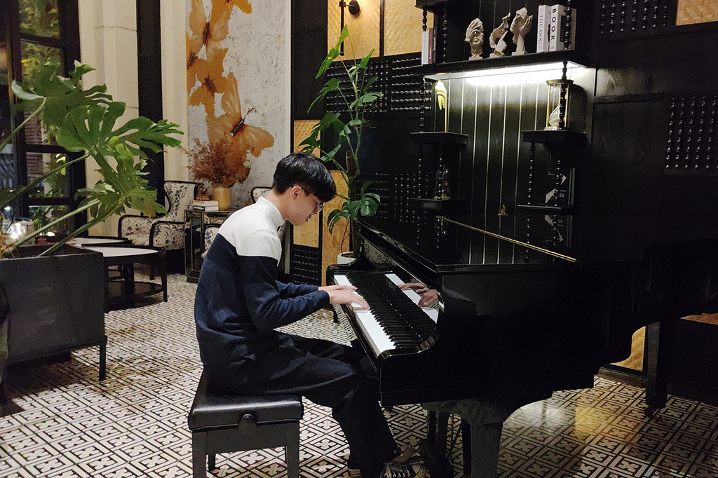 徵得飯店同意,兒子現場彈起鋼琴,我們還笑說看能不能駐彈抵房費呢!?