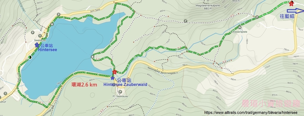 出發前原本預計的健行路線是從藍紹教堂走魔法森林到辛特湖,這是我從Alltrails網站Hintersee和Zauberwald Lehrpfad兩條軌跡拼湊出來的,全程約7公里。