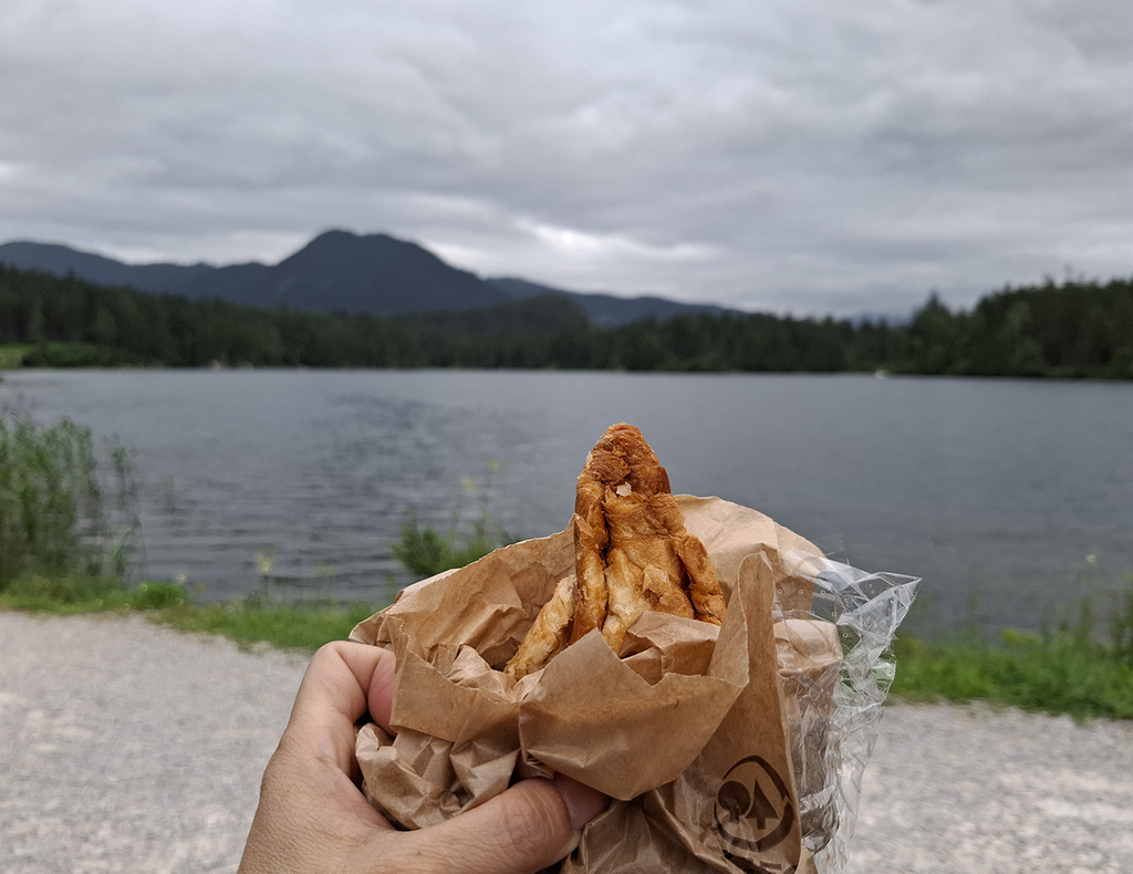 來到步道最西側,坐在湖邊長凳繼續啃著買了兩天已壓扁的可頌當下午茶,這幾天拜飯店早晚餐之賜,本來買了麵包當午餐,但早餐吃飽飽,連中餐都省下來了。