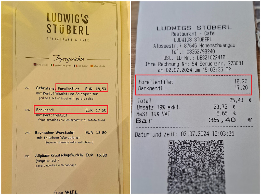 結帳時發現帳單不知為何都比菜單價格少€0.3?我們也沒有另外點飲料和給小費,實在沒有很愛啤酒和汽水。