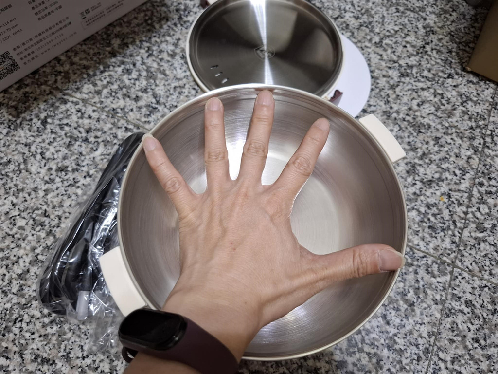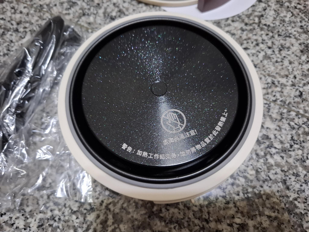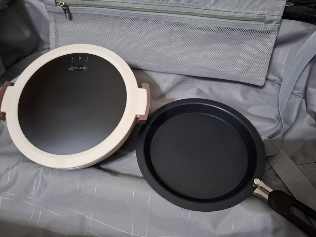 加熱主機裝在鍋內,還有一個不沾盤,連同電源線,裝在附贈的收納袋內,體積不大,但有點重量,大約1.5kg左右。