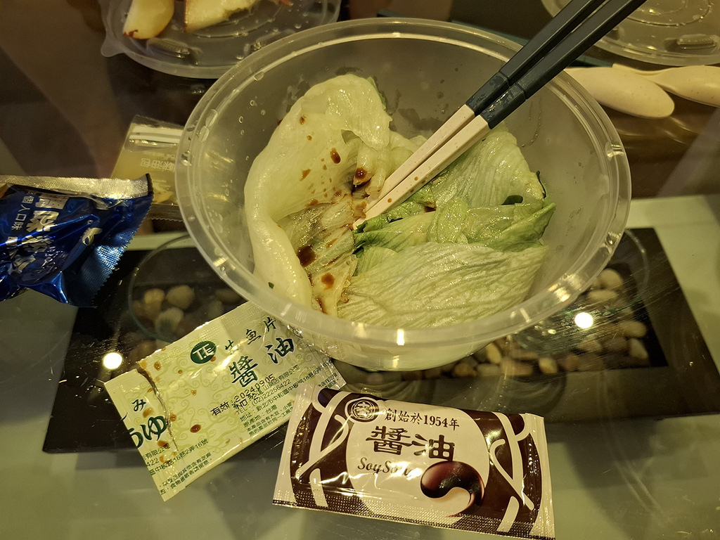 用從家裡帶過來的醬油包調味,另外多帶了2個耐熱碗盛裝。