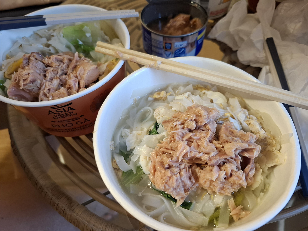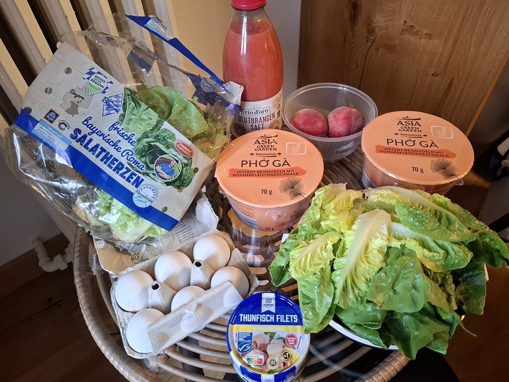 第三次是在GP小鎮的Weidegg - hotel garni煮晚餐,我們本想去超市買泡麵,但好像歐洲不盛興泡麵,只有找到越南河粉(0.99歐),有3種口味,素食、牛肉和雞肉口味,偏偏沒有海鮮口味,我們買了雞肉口味搭鮪魚罐頭(1.39歐)和雞蛋(6個1.89歐)和補充蛋白質。還有更便宜的生菜(0.79歐),又買了果汁(2.59歐),花不到8歐吃到還有剩。