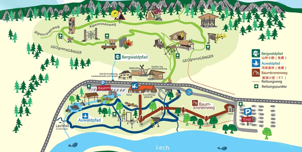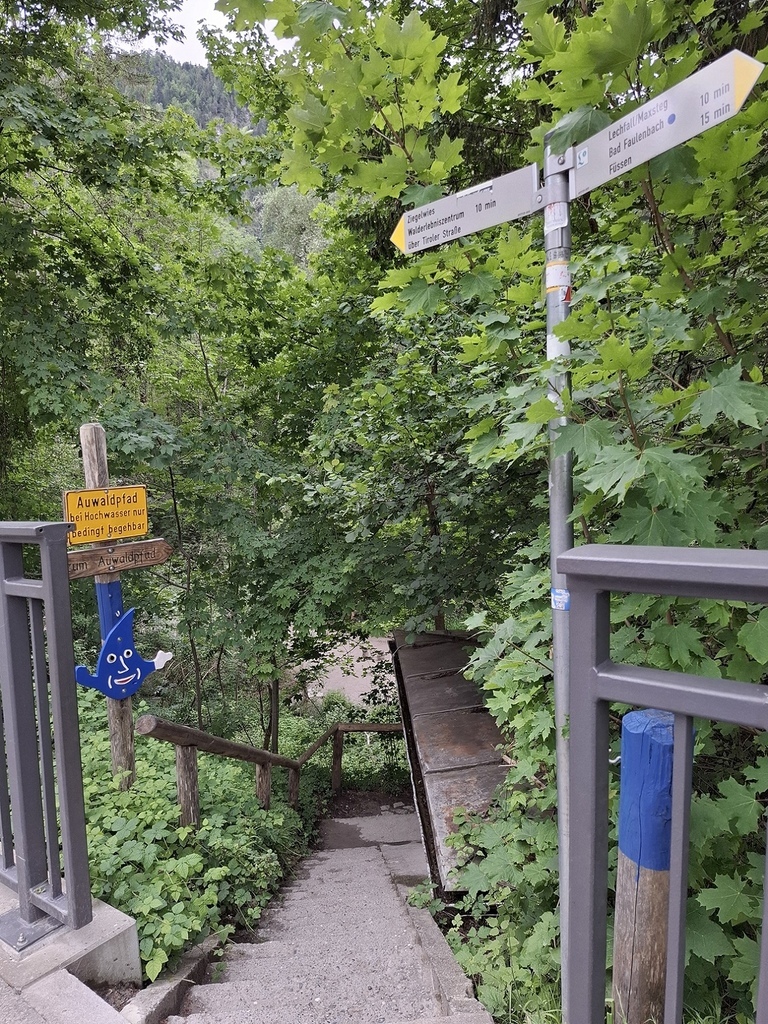 我們以羅曼蒂克大道終點之門Ende der romantischen Straße作為舊城區散策的終點,過萊希橋Lechbrücke走到萊希河Lech River以南的萊希瀑布Lcchfall和森林探險中心Walderlebniszentrum Ziegelwies的河岸森林步道Auwaldpfad和山林步道Bergwaldpfad,這一段跨越德奧邊境的散步路線。