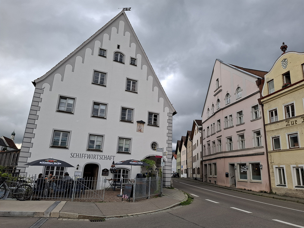 回到萊希橋,橋頭這間擁有陡峭的山牆屋頂和拱形入口的建築,也是17-18 世紀的古蹟了;右側也是新文藝復興結構,這些都是有列案的Füssen古蹟。