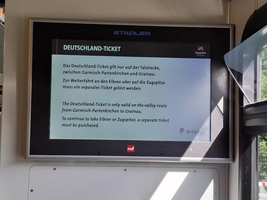 車上資訊看板特別提醒,49歐月票只能搭乘GP到格賴瑙這一段山谷路線。