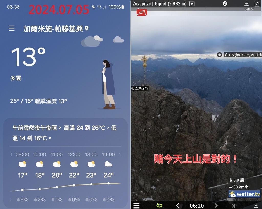 楚格峰畢竟是海拔相近3千的高山,而GP小鎮的海拔約700公尺,意味著山頂氣溫將比GP小鎮平地少12-13度!