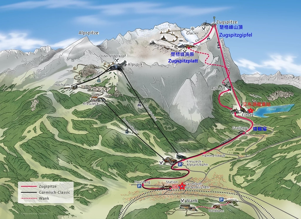 楚格峰門票包含3種交通工具,齒軌列車Zahnradbahn、冰川纜車Gletscherbahn、楚格峰纜車Seilbahn Zugspitze。