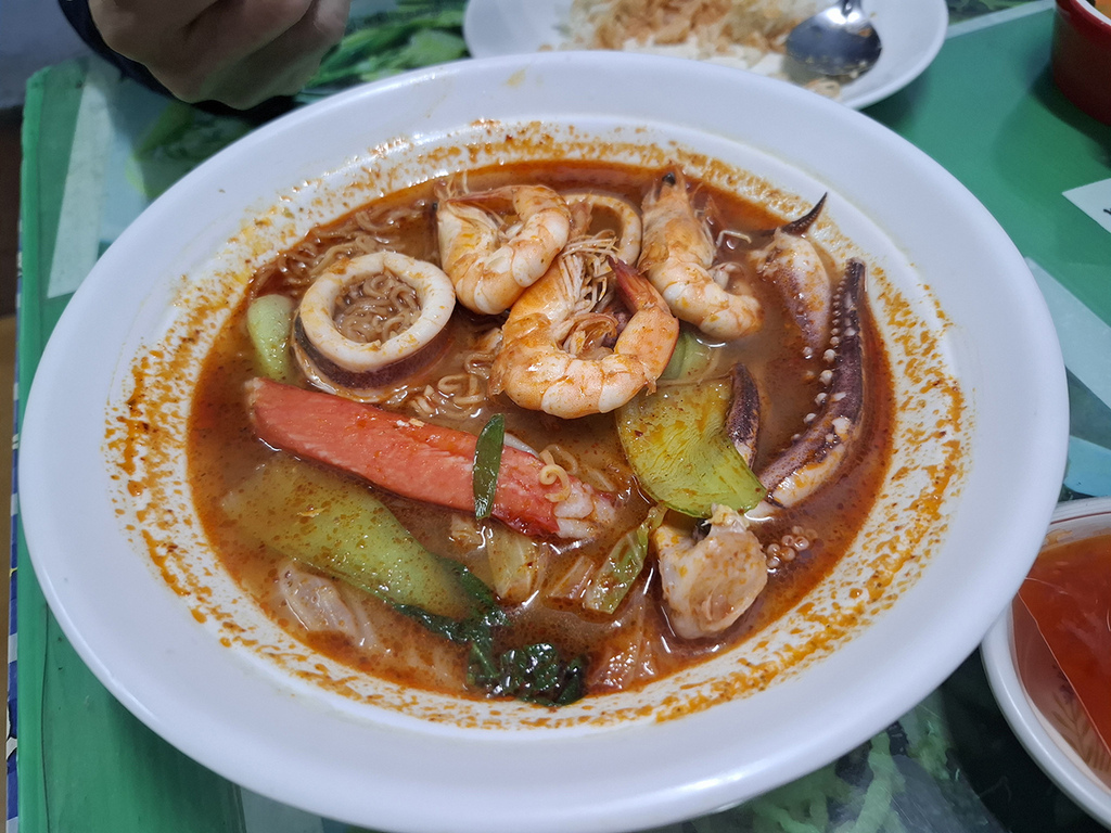 海鮮麵150,蝦子、透抽都很多,很有泰國味!看起來紅通通,但我覺得不算辣,一般人應該都可以接受!