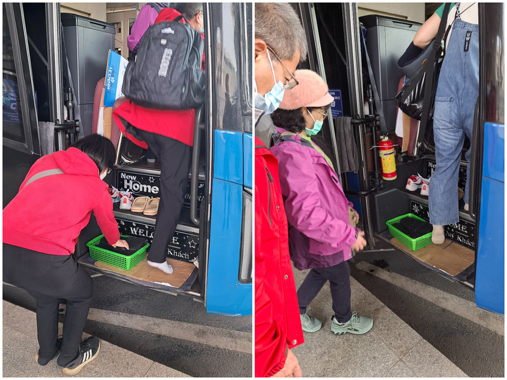 上車時要脫鞋,車門有提供塑膠袋讓乘客裝鞋子帶到座位上。