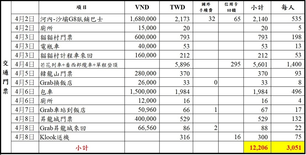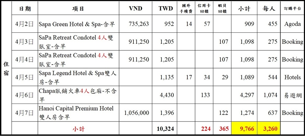 3.住宿3,260元/人:(含沙壩回河內交通費用)