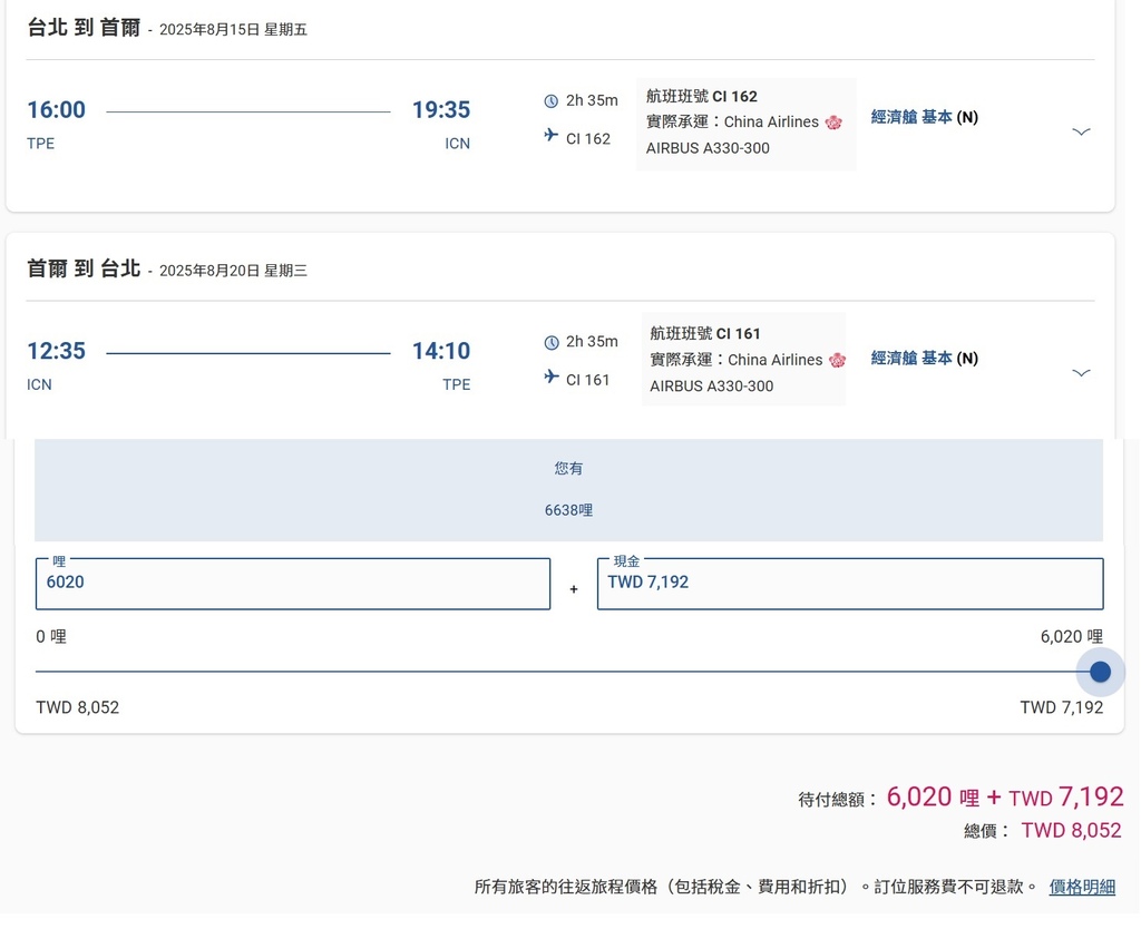 因2023年去維也納的華航哩程即將在2026.03.30過期歸零,雖然票價8052元比易遊網7993元又貴一些,但折抵票款後只要7192元。