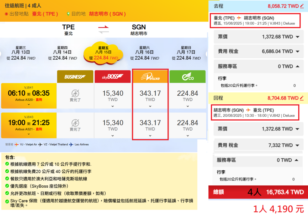 其中最吸引人的應該越捷飛胡志明市,官網限定含來回20kg行李的Deluxe方案不到4200元(可能還外要加手續費),加上簽證費也大概5千而已。雖然晚去午回,對我們中南部的人來說比較不累。