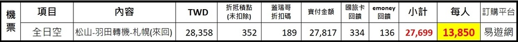 1.機票13,850元/人:訂單金額14,179元,扣除易遊網折扣碼、eMoney和信用卡回饋後,實付13,850元 。