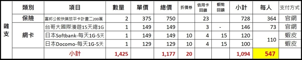 主要是保險和網卡。這次去10天,特別發現9天和10天的網卡有很大的價差,10天要360元以上,但9天以下只要300元以內,結果買2張5天的網卡比只買1張10天還便宜,中間再換卡就好!老公很少用網路,之前都是我開分享給老公用,但他要去蹲廁所啥的就沒網路,所以這次就幫老公辦台哥大漫遊,1G可用15天,很適合低度上網者使用。