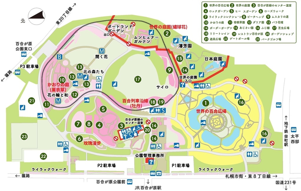 從官網下載的園區地圖,搭配花期,預計要走的路線:(1)世界のユリ広場/世界百合廣場(百合)→(2)世界の庭園(繡球花)→(18)リリートレイン/百合列車沿線(牡丹)→(10)かおりの庭/香織的花園(薰衣草)→(6)ローズウォーク/玫瑰漫步(玫瑰),但最後也沒照行程表走。