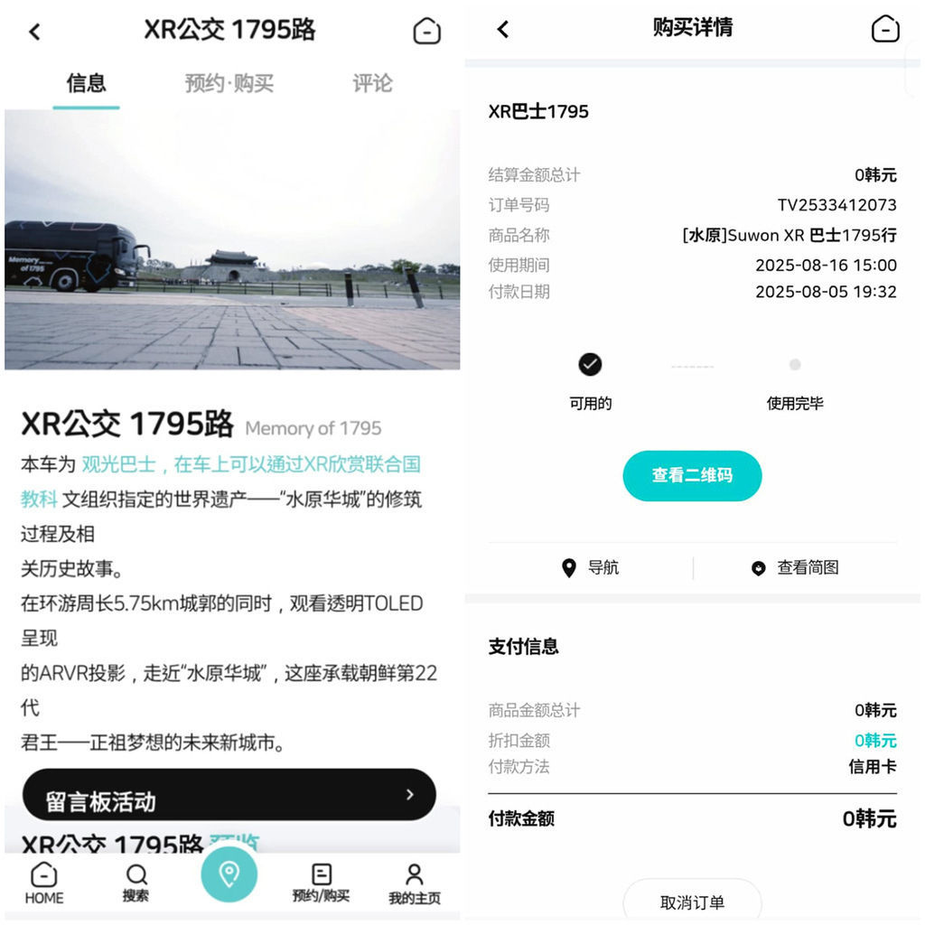 韓國觀光公社近期在好幾個地區陸續擴充旅遊設施,推出多樣獨具特色的智能旅遊資訊和優惠。其中水原市推出採用尖端的AR、XR進行玩樂的智能旅遊,除了這個「XR巴士1795路線」,還有「華城行宮的祕密」密室逃脫遊戲和「Flying水原」熱氣球體驗,但只有XR巴士是免費的喔!