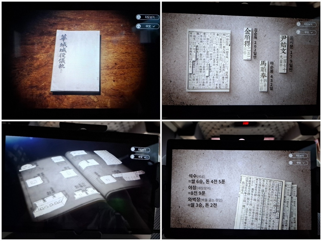 接著介紹1801年發行的《華城城役儀軌》,這本書不僅記錄了華城的建造計畫、製圖和樣式,還詳細記錄了施工器械、材料加工方法、工程日誌等,甚至每個施工人員的狀況與酬金計算等細節。這本書也讓後來韓國政府得以依此進行華城的修復工作,保持初建時的原貌,是一部具有特別歷史價值的文獻紀錄。