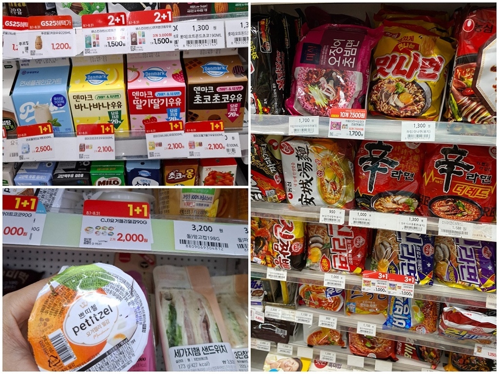 這附近就有GS25和CU兩家超商了,首爾超商不像台灣7-11或全家寬敞舒適,店面貨架之間非常狹窄。