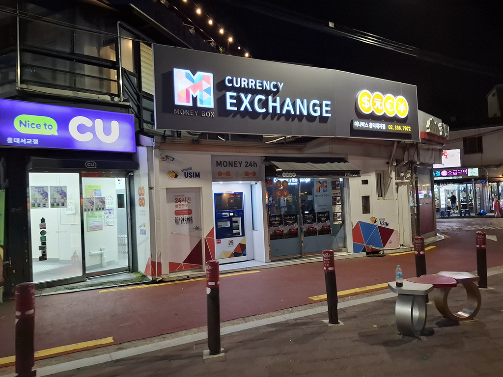 弘大幾家匯率較好的換錢所都只營業到10點,顯然是來不及了。原本備案就是隔天再去09:30 MoneyBox廣藏市場店營業再去換錢(延後1個多小時),後來忽然想到MoneyBox弘大店還有24小時的無人櫃員機可以換錢。