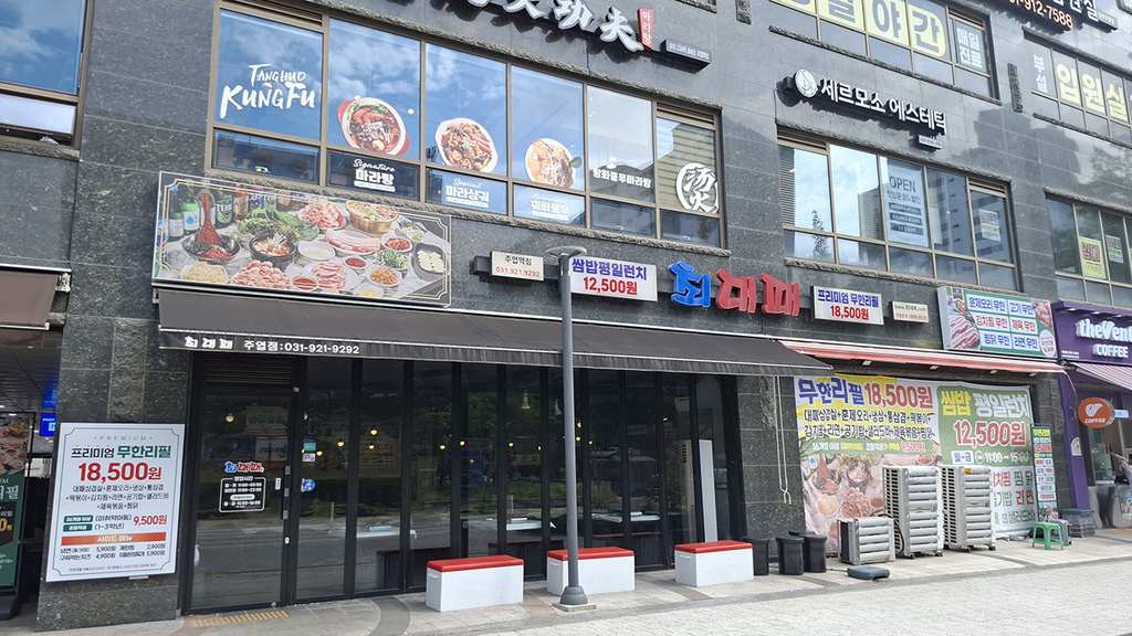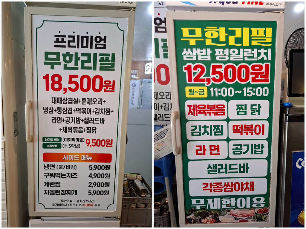 出發前我有再去看Naver地圖上店家菜單,韓文쌈밥평일런치(平日午餐包飯)₩12500、프리미엄 무한리필(高級無限續杯)₩18500,我以為吃到飽只是從₩16900漲到₩18500,午間價格變成只限平日,才特地改排週一過來。