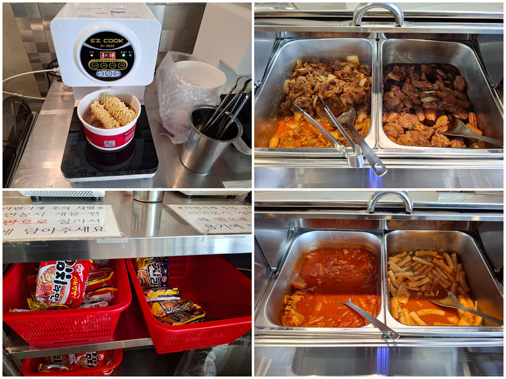 主要就是炒猪肉、蒸雞、和2種辣炒年糕。還有兩種拉麵,跟我們第一晚在超市買的一樣,所以我們都沒有拿來吃,剛好除了我們之外唯一的一組客人正在煮,就順便拍照,現在想想倒是應該來玩一下拉麵機看看XD