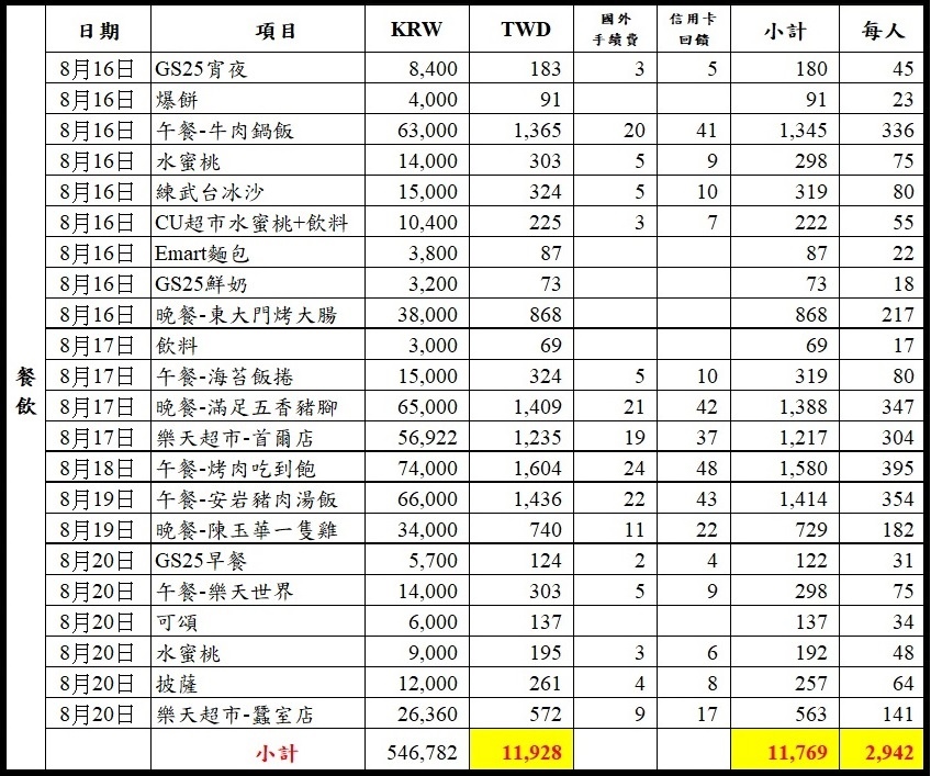 民宿不含早餐,早餐就買超市麵包、水果、乳製品簡單吃,DMZ跟團和樂天世界/韓國民俗村那天午餐也吃得很簡單。扣掉頭尾1人5天將近3000元,相當於1天600元差不多是台灣2倍沒錯吧!