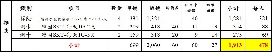 總計:全家4人7日總旅費69,914元,平均1人17,477元。