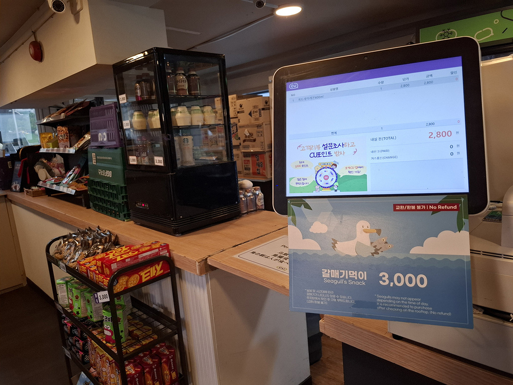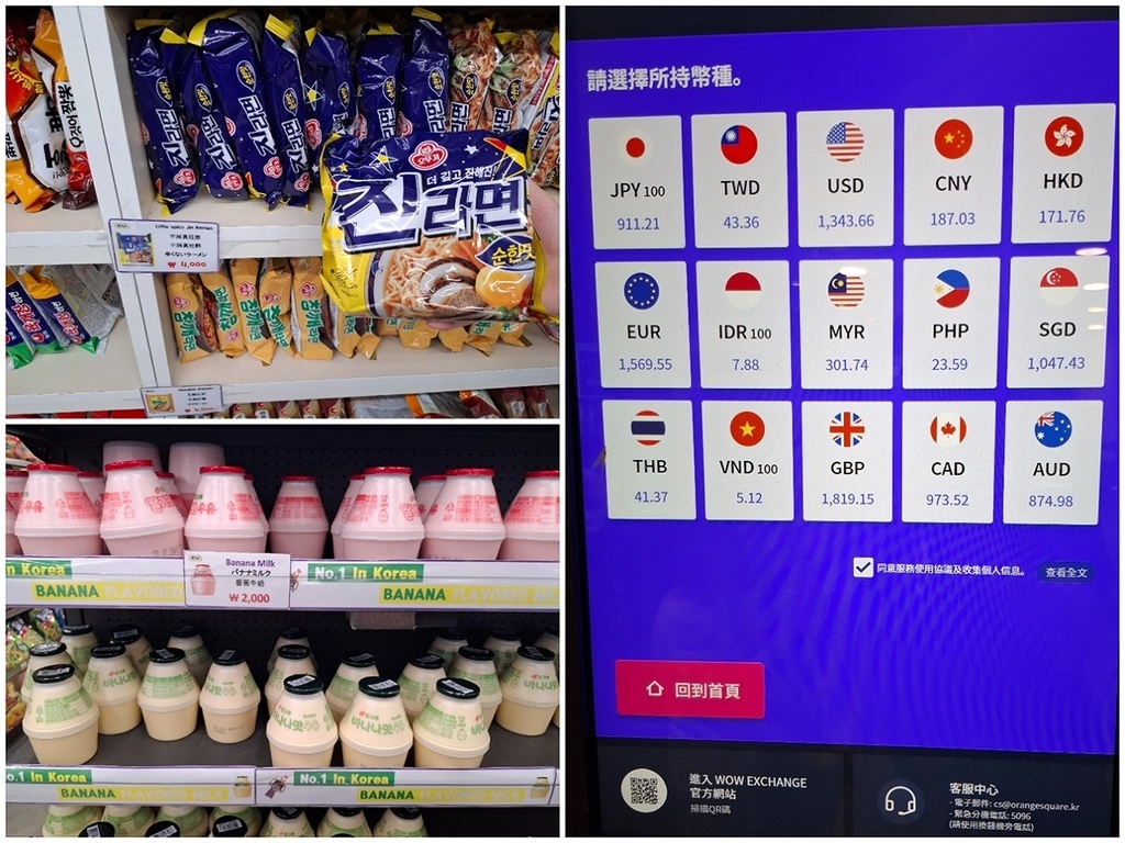 這裡也有一家CU,但同樣的拉麵我們第一天買1包₩1000,買3還送1,這裡1包居然就要₩4000,實在太扯了!香蕉牛奶就沒漲得那麼誇張。另外也有換錢機,台幣匯率43.36,跟我前2天在MoneyBox廣藏市場店換43.7,就沒有差很多。