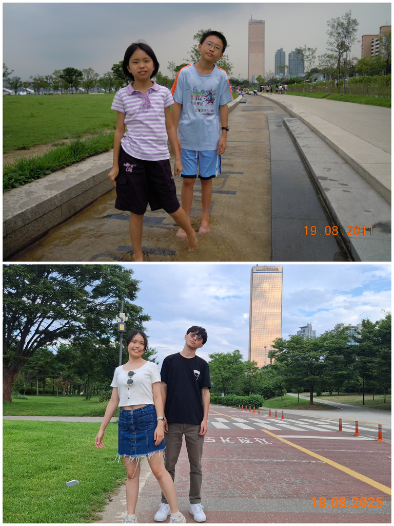 我們很想去找當年的足跡來復刻舊時光,但那次我們是去汝矣渡口站西側的鋼琴水道,但漢江遊覽船的碼頭則是在東側,距離約1.2km,來回就2.4km,我們實在沒時間也沒體力再走到那裡了,所以就以後面那棟金黃色的63大廈為背景,來呈現14年後兩個孩子的成長吧!