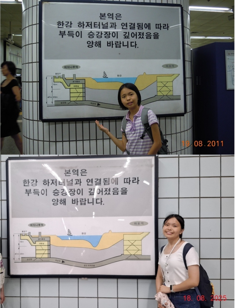 回程在汝矣島渡口站,我才瞥見了這個熟悉的告示牌!這個地鐵站與漢江地底隧道相連,是首爾地鐵圈地下最深的車站,月台直下地底近50公尺呢!告示牌完全沒變,小女孩變小女人了!舊地重遊更強烈感受到這種歲月如梭的心情!