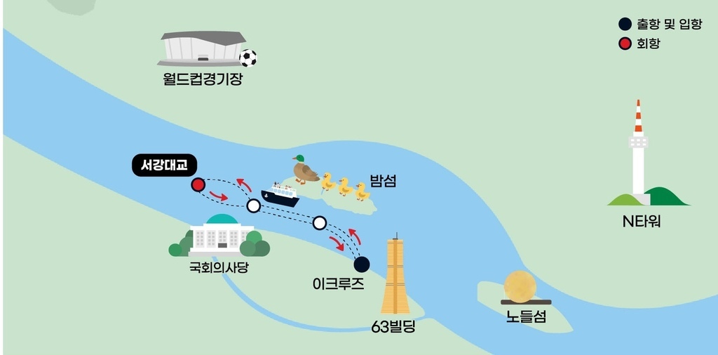 這條日落遊輪是往西經麻浦大橋到西江大橋後就折返,全程只有40分鐘;月光音樂遊輪則是往東至盤浦大橋後折返、全程70分鐘。兩條航線完全相反,日落遊輪足足少了半小時,但我和女兒已經是第二次搭依戀遊船E.Land Cruise,所以也不想搭那麼久,才選擇搭日落遊輪,感受不同漢江風情。