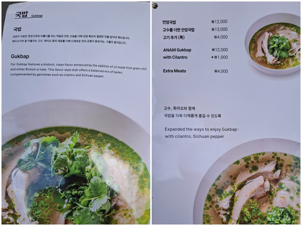 印象中有中文菜單,本來是要直接點4碗湯飯就好;但菜單有雙人套餐,工作人員就問我們要不要點,問了一下套餐內容候,一時腦霧了,還以為多送飲料,也就點了1份雙人套餐,另外2碗就單點,匆忙間忘了說不要香菜,多花了₩2000!總共₩66000,帳單台幣1437元,人均359元。
