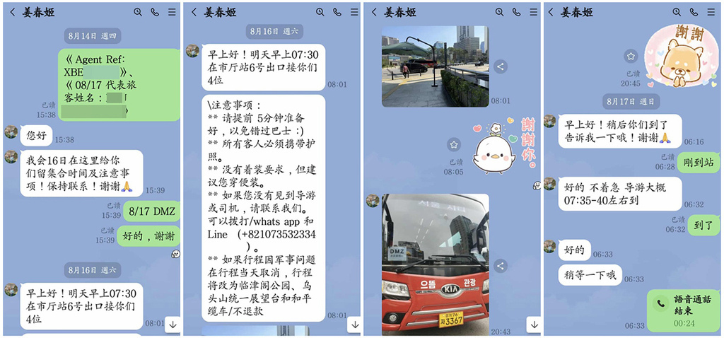 訂購成功後收到客服通知,請我盡快與當地供應商工作人員聯繫(加line或微信),然後出發前一天,當地旅行社就會與我們聯繫注意事項,還有傳集合地點和車牌號碼的照片給我們。