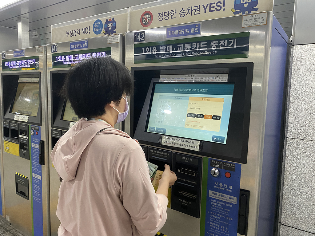 結果沒想到,自助儲值機儲值氣候卡短期券是不接受5萬韓幣的紙鈔!我們儲值到最後一張氣候卡就沒有1萬韓幣紙鈔了,清晨不到7點也找不到服務人員!我們趕忙找路人看能不能換錢,但一大早搭車的人也很少,問了2人都沒有(也可能不懂我要幹嘛),我趕忙走出地鐵站看有沒有超商可以換,結果也沒有!好不容易遇到1位好心人跟我換了5張1萬韓幣,順利完成儲值!當然若真的換不開,大不了就先用Tmoney應急一下。