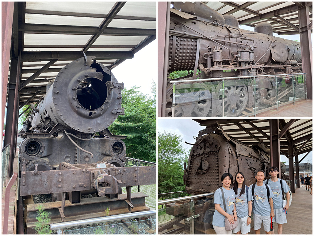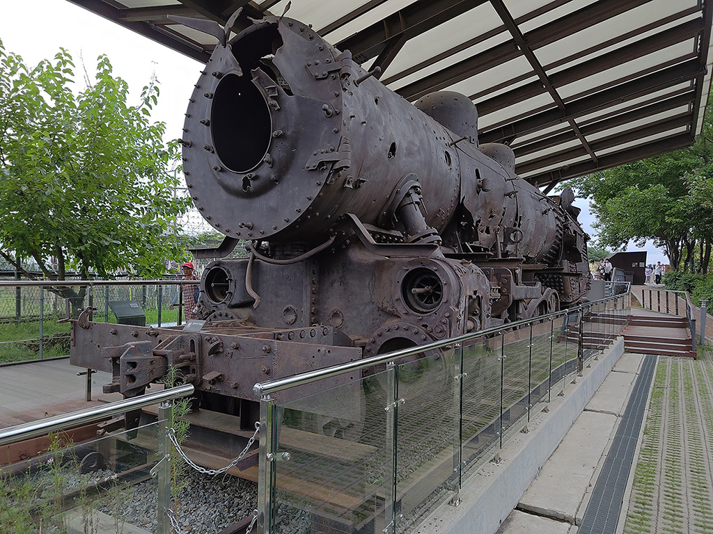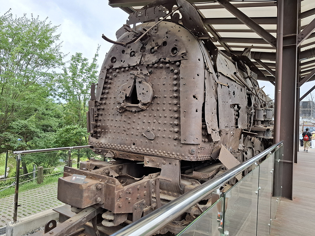 火車頭上的千瘡百孔個彈孔和扭曲變形的車輪訴說著戰爭時的恐怕景象。