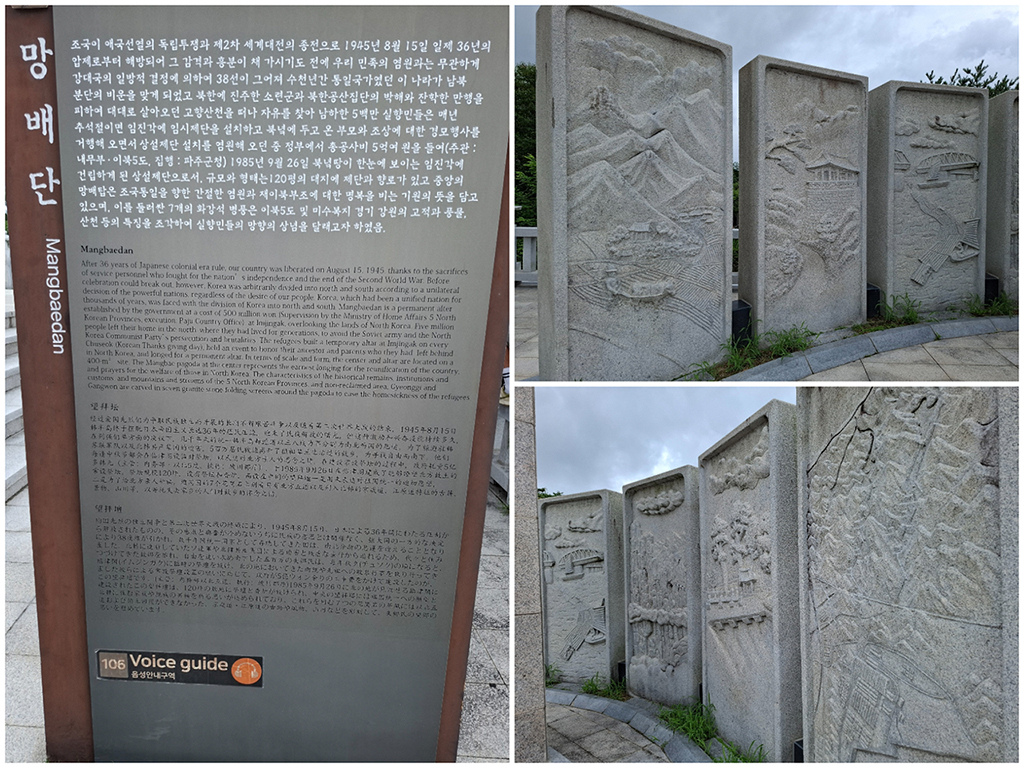 環繞祭壇的七塊花崗岩屏風上雕刻著北部五道以及列入北韓的京畿道和江原道的歷史遺跡、風景、山川,以寄託思念故鄉的心情。